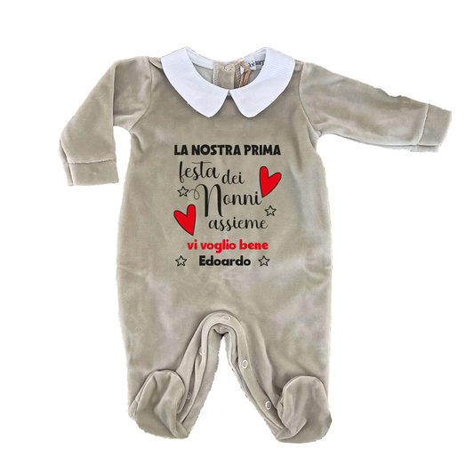 Prima festa dei nonni - Pagliaccetto Neonato in Ciniglia con Colletto Bianco personalizzato con nome