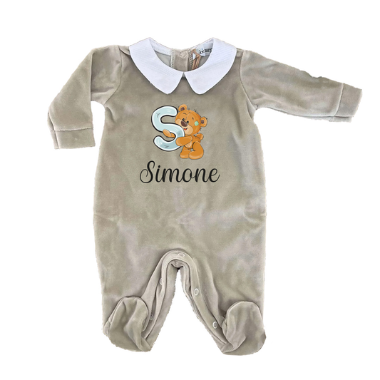 Teddy Bear - Pagliaccetto Neonato in Ciniglia con Colletto Bianco Personalizzato con nome e iniziale