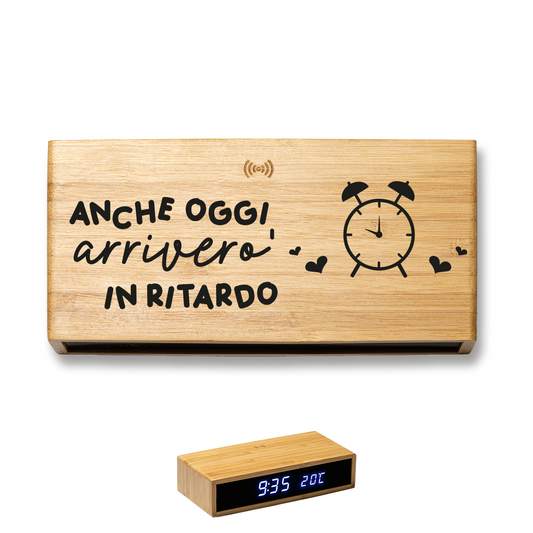 Anche oggi arriverò in ritardo - Sveglia Digitale in Bambù con Orologio da Tavolo