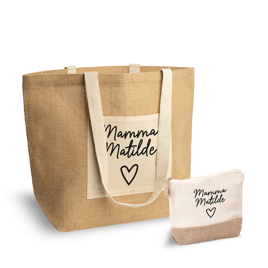 Mamma name - Set Combo Borsa mare e Pochette in Juta laminata - personalizzata con nome