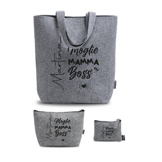 Moglie, Mamma, Boss - Tris Borse in feltro con designe melange - personalizzato con nome