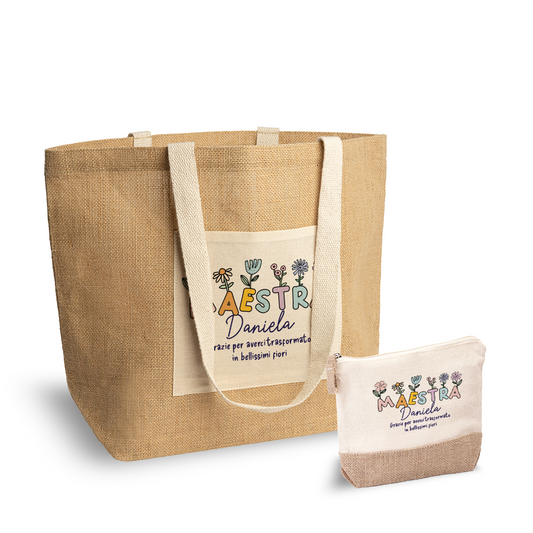 Bellissimi fiori - Set Combo Borsa mare e Pochette in Juta laminata - personalizzata con nome