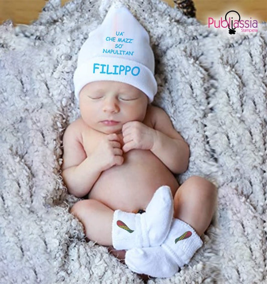 Ua' ch Mazz' so' Napulitan - Set Nascita Cappellino + Calzini - personalizzato con nome
