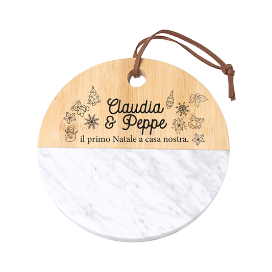 Il primo Natale a casa nostra - Tagliere in marmo e bamboo naturale - personalizzato con nomi