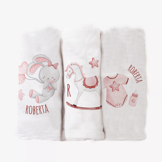 Baby Pink Girl - Set 3 pezzi mussole personalizzate con nome