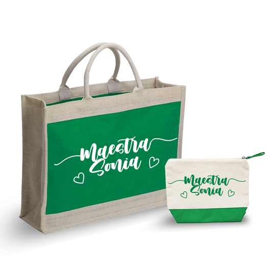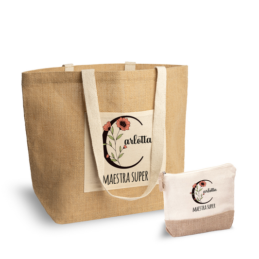 Maestra super - Set Combo Borsa mare e Pochette in Juta laminata - personalizzata con nome e iniziale
