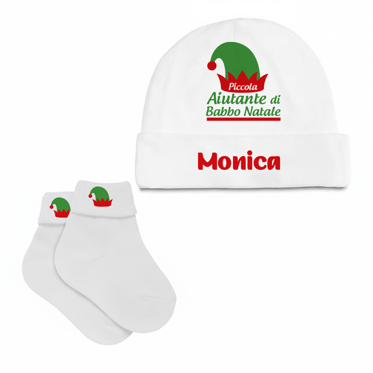 Piccola Aiutante di Babbo Natale - Set Nascita Cappellino + Calzini - personalizzato con nome