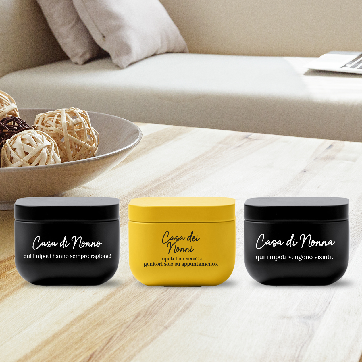 - Set di tre candele profumate con possibilità di personalizzazione dei nomi, ideale per un regalo speciale dedicato ai nonni