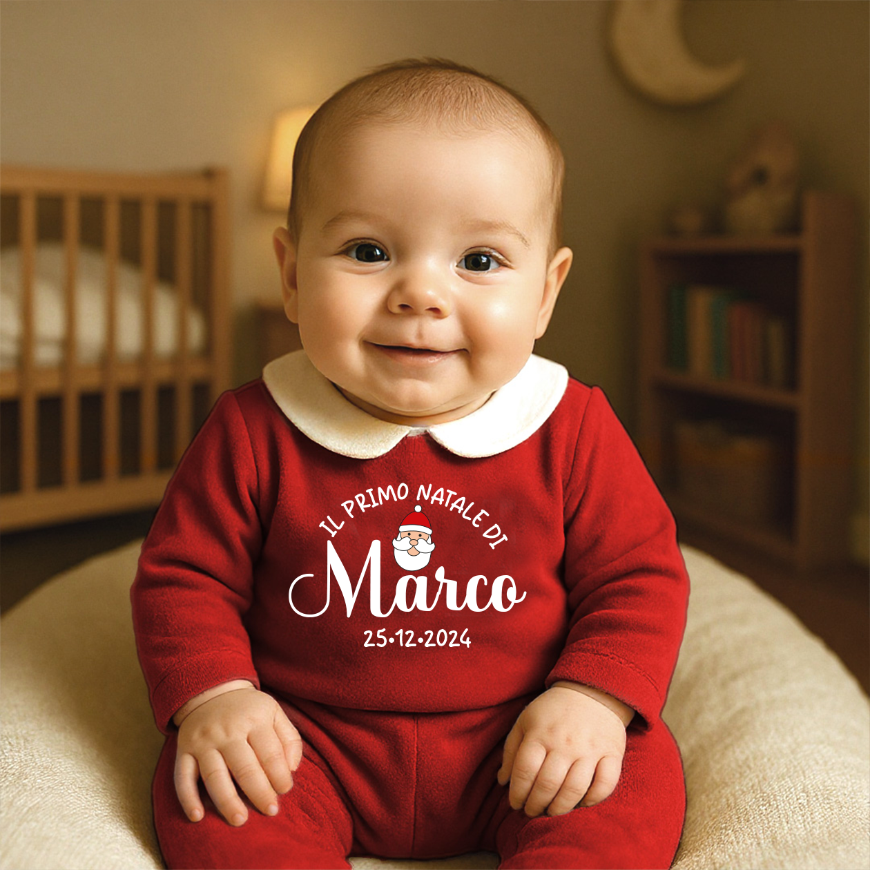 Il primo Natale di... - Pagliaccetto Neonato in Ciniglia con Colletto Bianco - personalizzato con nome e data