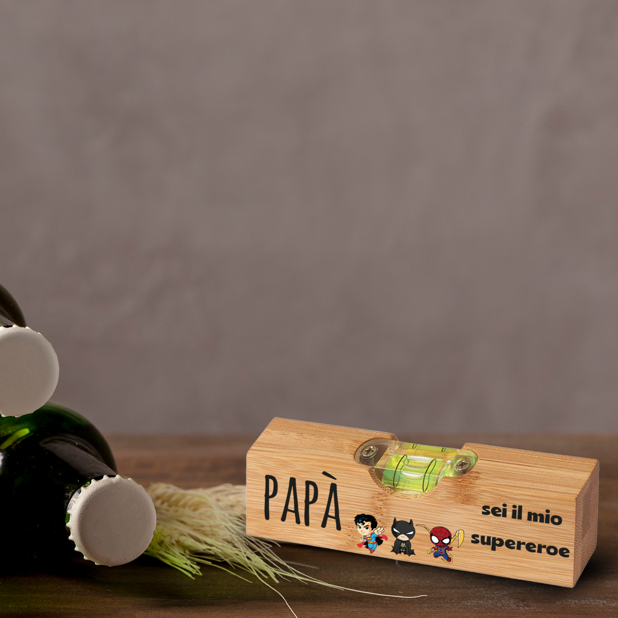 Papà sei il mio supereroe - Apribottiglia con mini livella