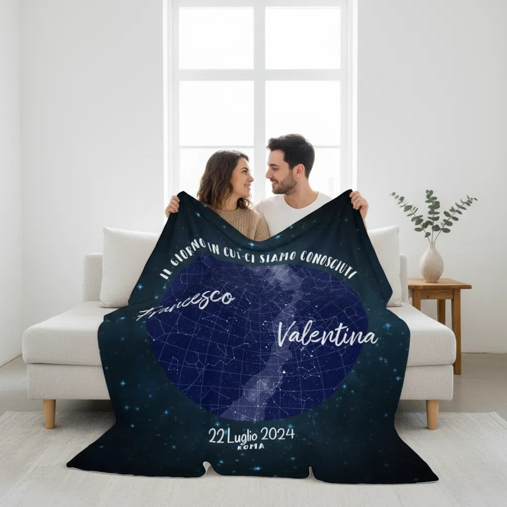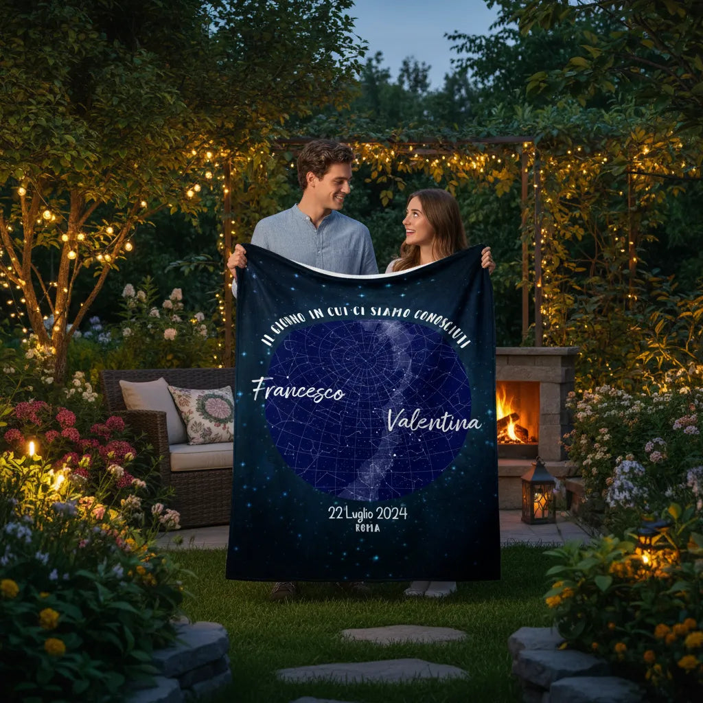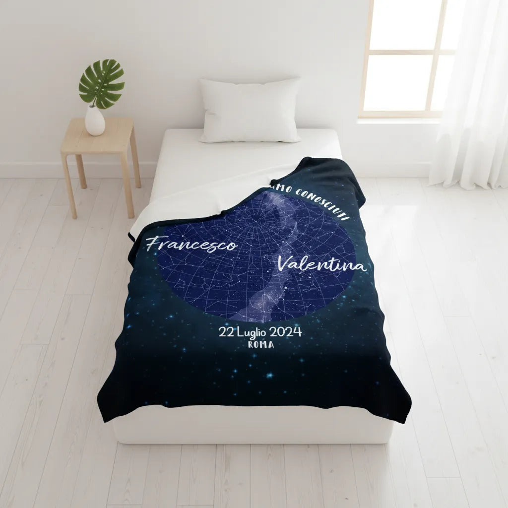 Questo plaid personalizzabile trasforma un ricordo intangibile in un abbraccio caldo e tangibile. Basta indicarci dove e quando è scoccata la scintilla, e noi stamperemo sul tessuto la mappa delle stelle che brillavano sopra le vostre teste in quell'istante.