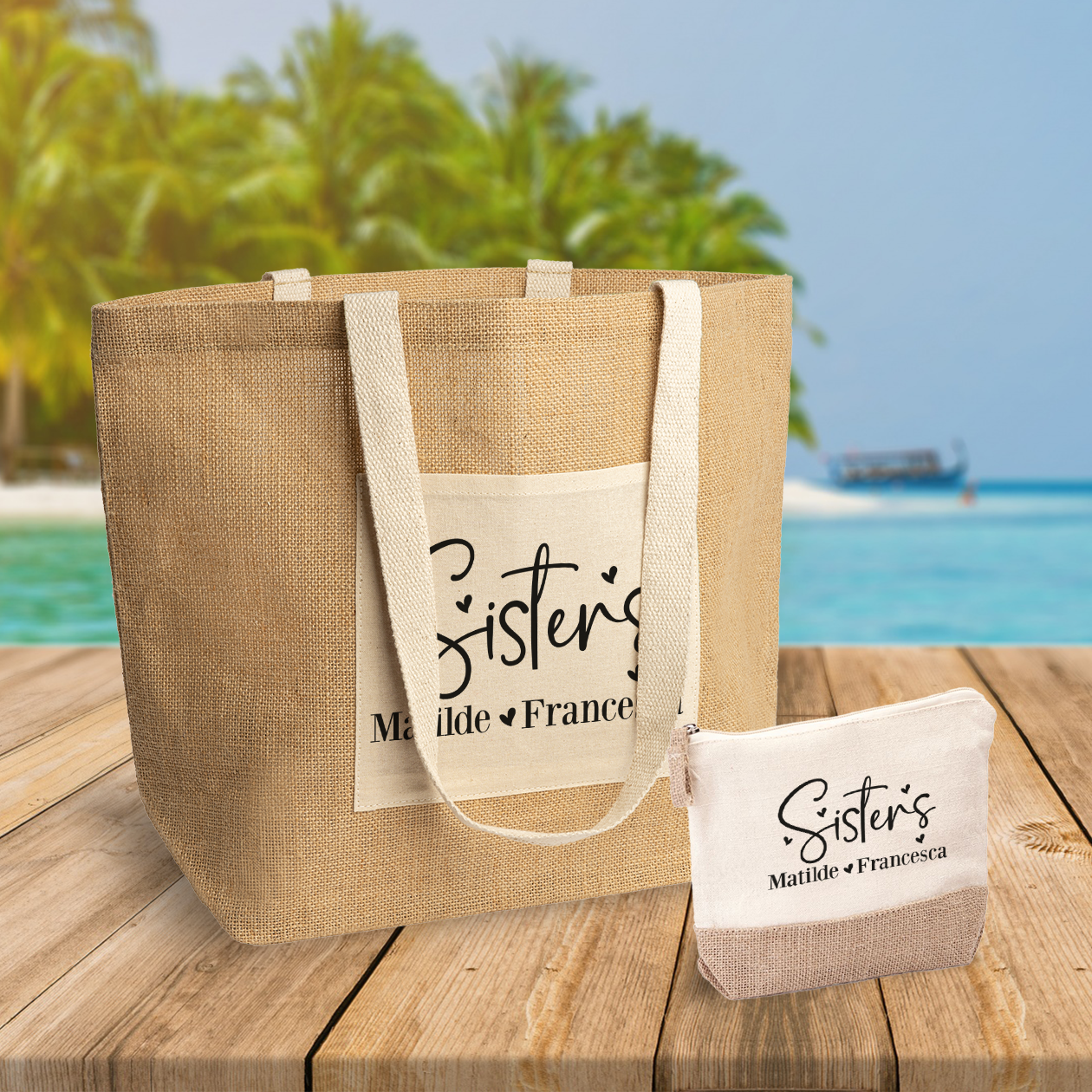 Sisters hearts - Set Combo Borsa mare e Pochette in Juta laminata - personalizzato con nomi