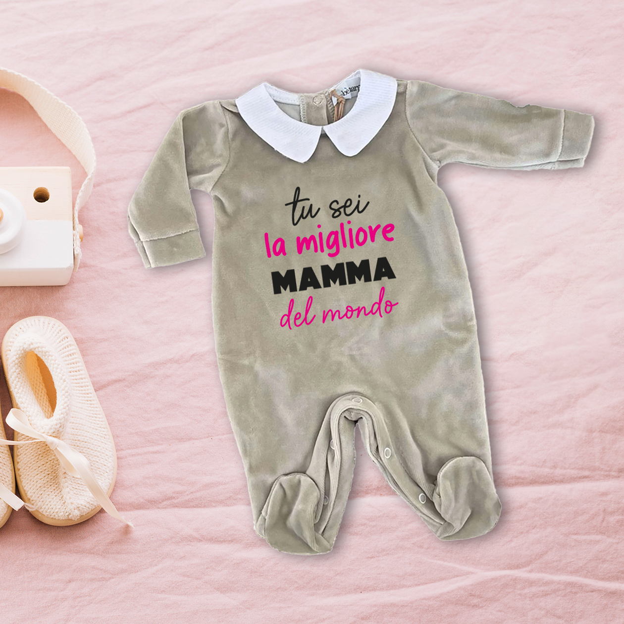 Tu sei la migliore mamma del mondo - Pagliaccetto Neonato in Ciniglia con Colletto Bianco