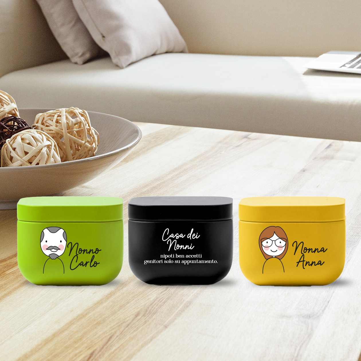- Set di tre candele profumate con possibilità di personalizzazione dei nomi, ideale per un regalo speciale dedicato ai nonni